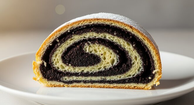 Close-up of a delicious slice of poppy seed roll dusted with powdered sugar on a white plate.