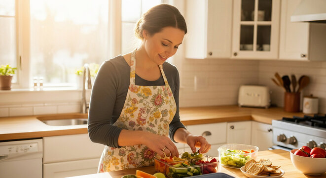 Smiling woman prepping healthy snacks in a bright kitchen for meal planning and mindful eating