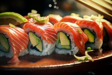 Generative AI illustration of closeup of delicious fresh sushi rolls with salmon and avocado and rice placed on wooden tray against blurred background