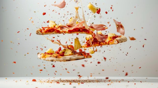 A slice of pizza captured in mid-air with toppings flying off, creating a dynamic and vibrant explosion of cheese, sauce, and ingredients against a light background.