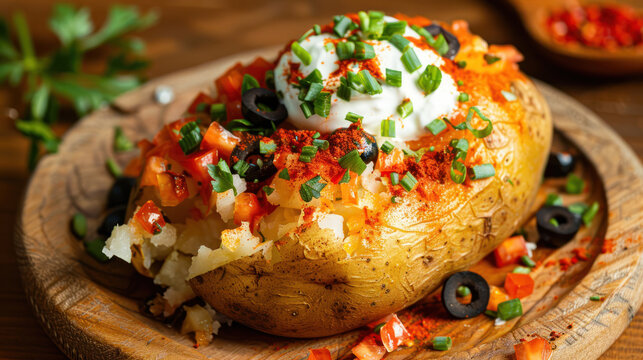 Turkish kumpir food loaded baked potato with colorful toppings including sour cream and chives on wooden board