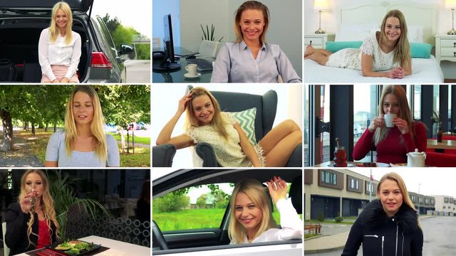 Happy smiling young blonde woman sitting in nature green park outdoors using mobile phone. Winning woman playing game, paying bills, good shopping. High quality FullHD footage