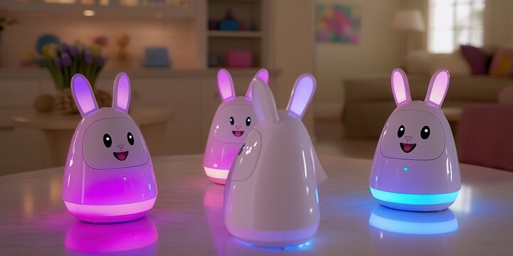 Three charming white bunny-shaped lights rest gracefully on a table, creating a delightful and whimsical ambiance in the room.