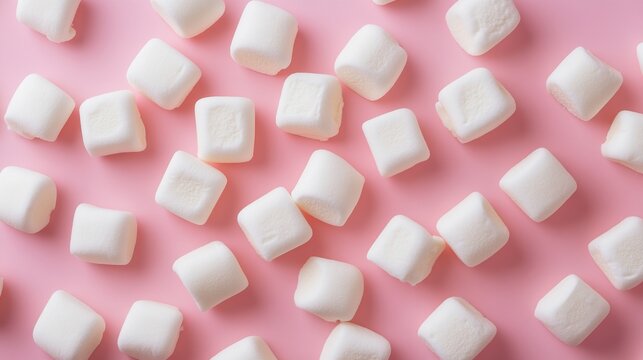A close-up shot of marshmallows scattered across a pink surface, creating a playful and textured pattern.