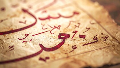 Magnificent red Arabic calligraphy text painted on ancient aged textured paper manuscript close up depicting traditional Islamic art and historical knowledge background