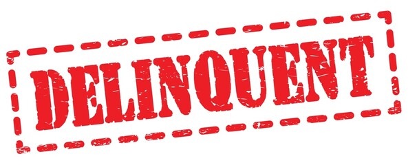 Delinquent. Document with label. Desk with books and judges gavel in a lawyer's office.