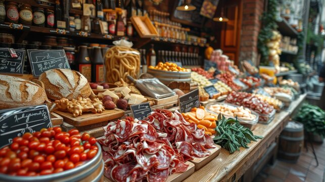 An artisanal deli displays an array of gourmet foods such as cheeses, meats, and fresh bread in a rustic setting