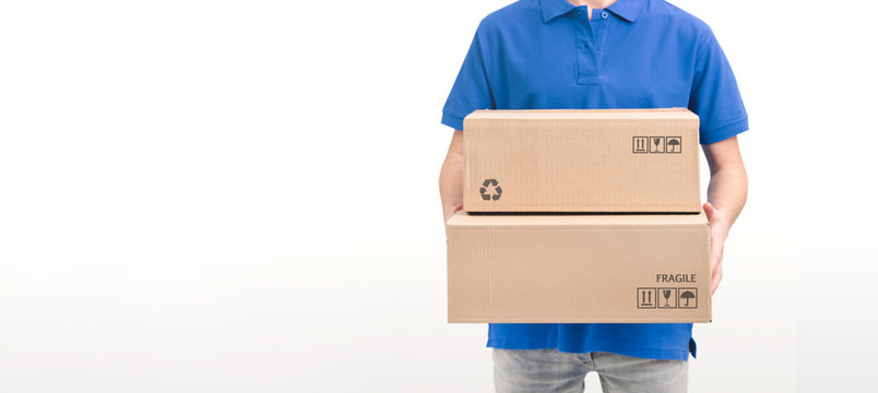 Close up parcel in hand of blue uniform delivery man to customer front of the house from shopping online with good service. Courier man delivering a cardboard box postal package to destination.