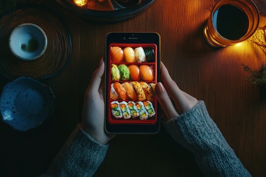 Top view of smartphone with sushi delivery options, female hand and warm lighting