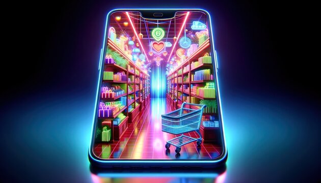 E-shopping concept 3D rendering of a vibrant photo where a smartphone stands upright, its screen unfolding to reveal a bustling digital Neon-lit shop