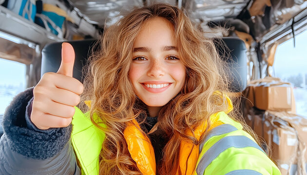 Smiling delivery driver inside van symbolizing worldwide logistics services