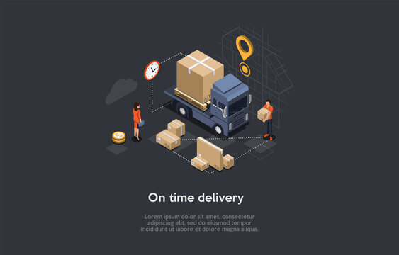 Isometric Illustration With Writing And Characters. Vector Composition In Cartoon 3D Style On Time Delivery, Internet Order Arrival, Goods Transportation Service Concept. Truck With Parcels, Worker