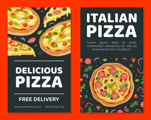 Delicious Italian pizza free delivery flyer template. Pizza shop business card, banner, promotional leaflet vector