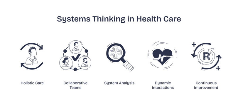 Systems thinking in health care focuses on holistic care, collaborative teams, and continuous improvement, transparent background. Doodle style icons.