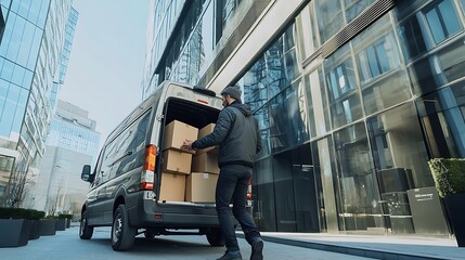 A man is unloading boxes from a van in front of a building