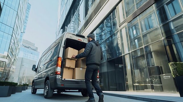 Close up of a delivery man unloading boxes from a van on a sunny day, home delivery service with a focus on safety and care, ensuring timely arrival.