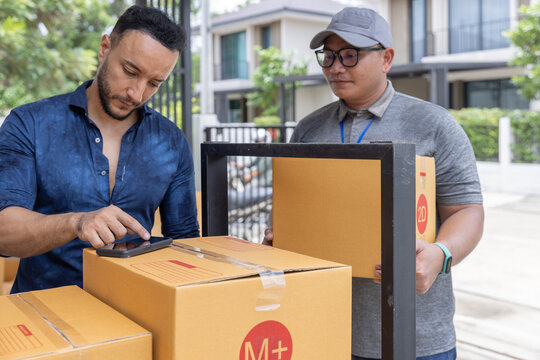 Two Young Delivery Man Carrying Cardboard Box and check the items in the cardboard box.