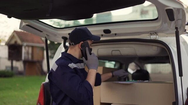 Handsome delivery man checking delivery list while talking on the phone. Delivery man in cap and gloves with phone and documentation in hands outdoor. Trunk with parsels