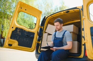 Man courier. Guy with box and tablet. Courier stands in front of minivan. Guy courier near entrance to warehouse. Man in yellow vest works as delivery man. Delivery man with cardboard box