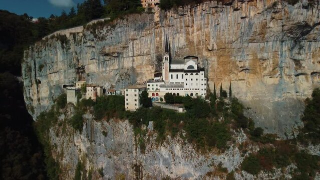 Aerial View of Madonna della Corona, Cliffside Sanctuary in Italy's Veneto, Surrounded by Dramatic Alpine Scenery