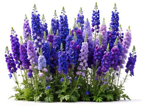 Tall Spikes of Delphinium Blooms Isolated on Transparent Background PNG.