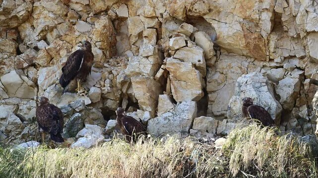 Vier halbwüchsige Adlerbussarde im Felsennest betteln nach Futter // juvenile Long-legged buzzard (Buteo rufinus) - Donaudelta, Rumänien