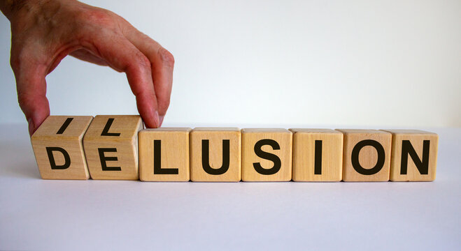Hand turns a cube and changes the word delusion to illusion. Beautiful white background. Business concept. Copy space.