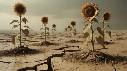 Sunflowers drooped in a dry and desolate field. Climate change and desertification. Absence of moisture resulted in the demise of all the vegetation.
