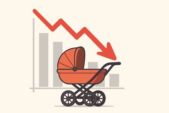 Falling birth rate concept: downward bar chart with red arrow and blue baby stroller illustrating declining fertility, demographic crisis, aging population, economic impact, cartoon