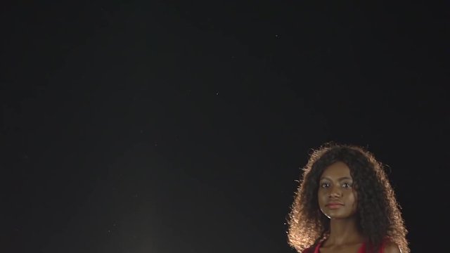 Models walk and look into the distance. Black background. Slow motion