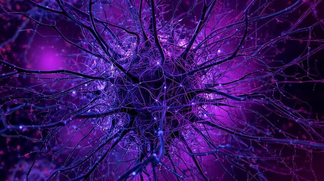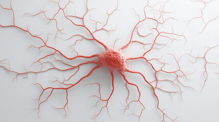 Intricate Neuron Network: Microscopic view of a vibrant red neuron cell with its complex dendritic branching network.