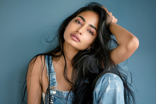 A portrait of a young Indian woman with long black hair, wearing denim overalls and looking directly at the camera with a confident expression