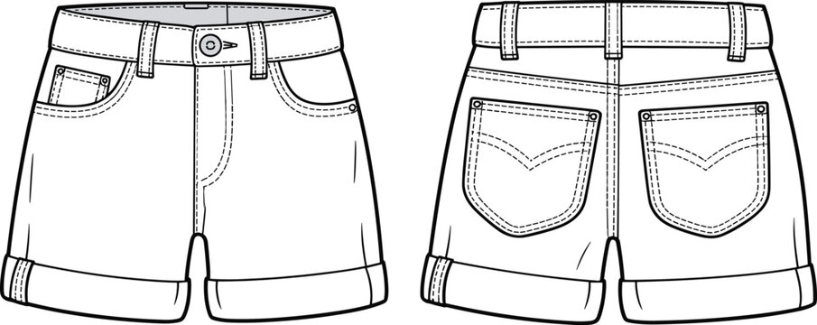 denim shorts flat sketch front and back view technical cad drawing template, womens five pocket denim jean short pant vector illustration template. isolated on white background.