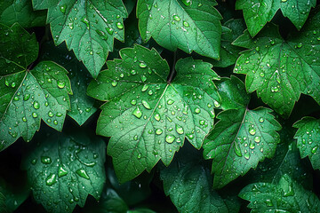 Lush, green foliage and grass create a vibrant, natural texture, showcasing a dense arrangement of leaves in various shades of green.