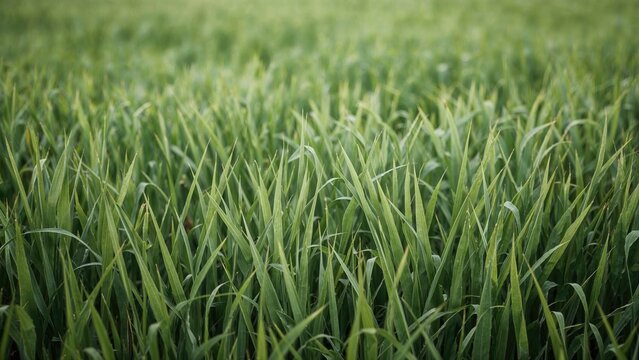 Green field of grass or crops with lush, tall, and dense vegetation.
