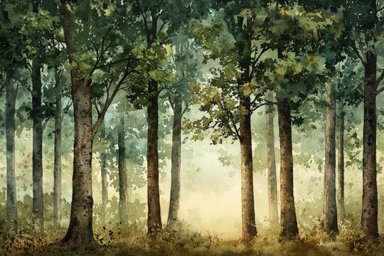 Serene watercolor forest with sunlight filtering through lush green foliage