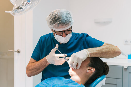 Surgeon and nurse during a dental operation, Team of dental surgeons performs surgery on teeth in a modern clinic, General anesthesia during orthodontic surgery. ai generative
