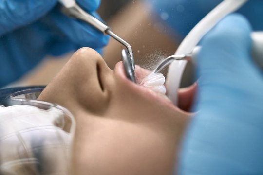 Overview of dental caries prevention. Girl at the dentist chair during a dental scaling procedure. Healthy Smile.