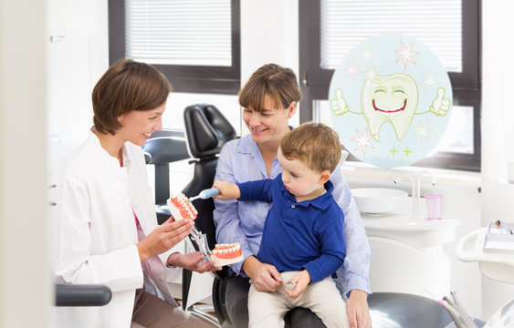 Dentist teaching boy on mothers lap how to brush teeth