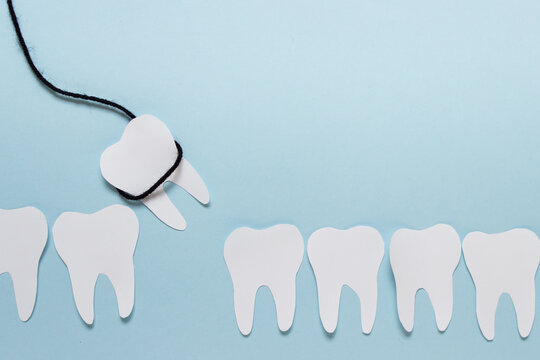 Simple dental tooth extraction concept made of paper and black rope on blue background
