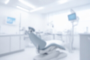 Blurred dentist office interior with empty chair, dental instruments, modern clinic room, professional healthcare setting, oral care equipment