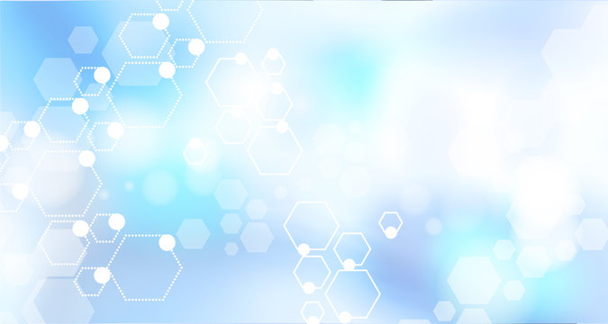 Hospital blurred background. Medical backdrop with molecules. Blur interior inside building with light background. Vector illustration