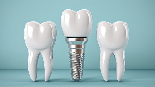 A dental implant crown with a screw-like base is positioned between two natural teeth on a blue background