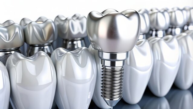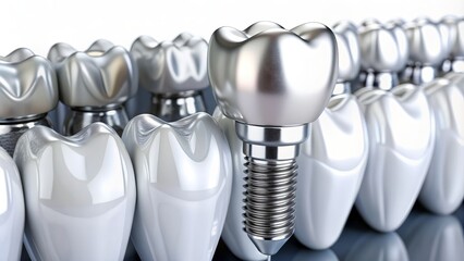 Premolar and Molar tooth crown installation over implant abutments. Medically accurate 3D illustration of human teeth and dentures concept