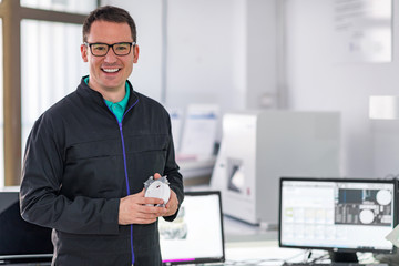 Closeup portrait of allied health dental professional in blue scrubs examining dental x-ray on computer screen, isolated dentist office
