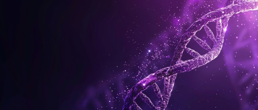 Close-up of a DNA double helix structure, illuminated in purple, representing genetic research, biotechnology, and molecular biology.