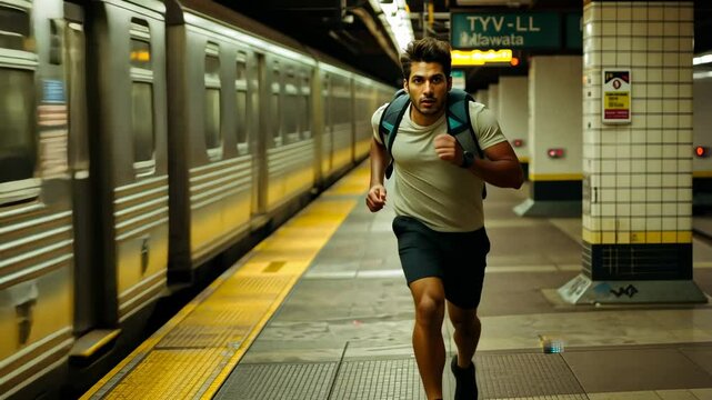 A man dashes through a subway station, the warm glow from the train lights creating dynamic shadows on the platform as he races to catch a departing train.