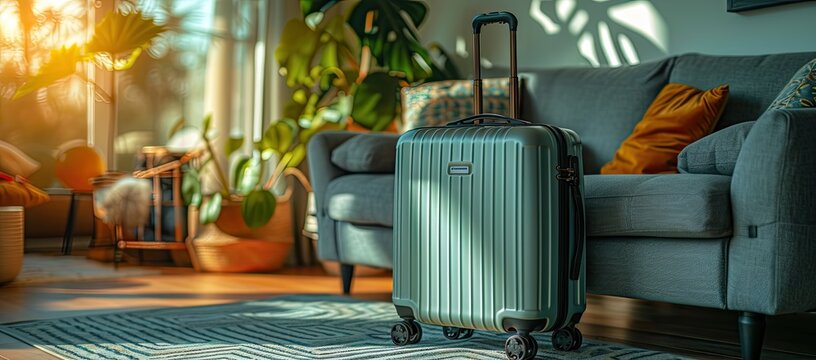 Blue suitcase with sun glasses, hat and camera on pastel blue background. travel concept minimal . 3d rendering, Generative AI