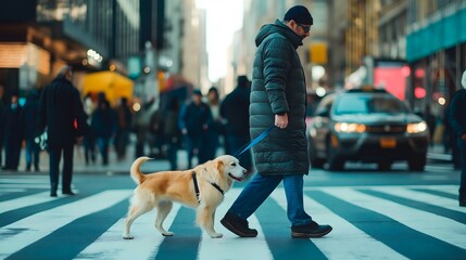 Man walking with a dog across a busy city crosswalk on a sunny day, highlighting independence, urban accessibility, and the important role of service animals in daily life