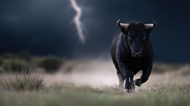 Powerful Black Bull Running Through Storm with Lightning in Dramatic Landscape